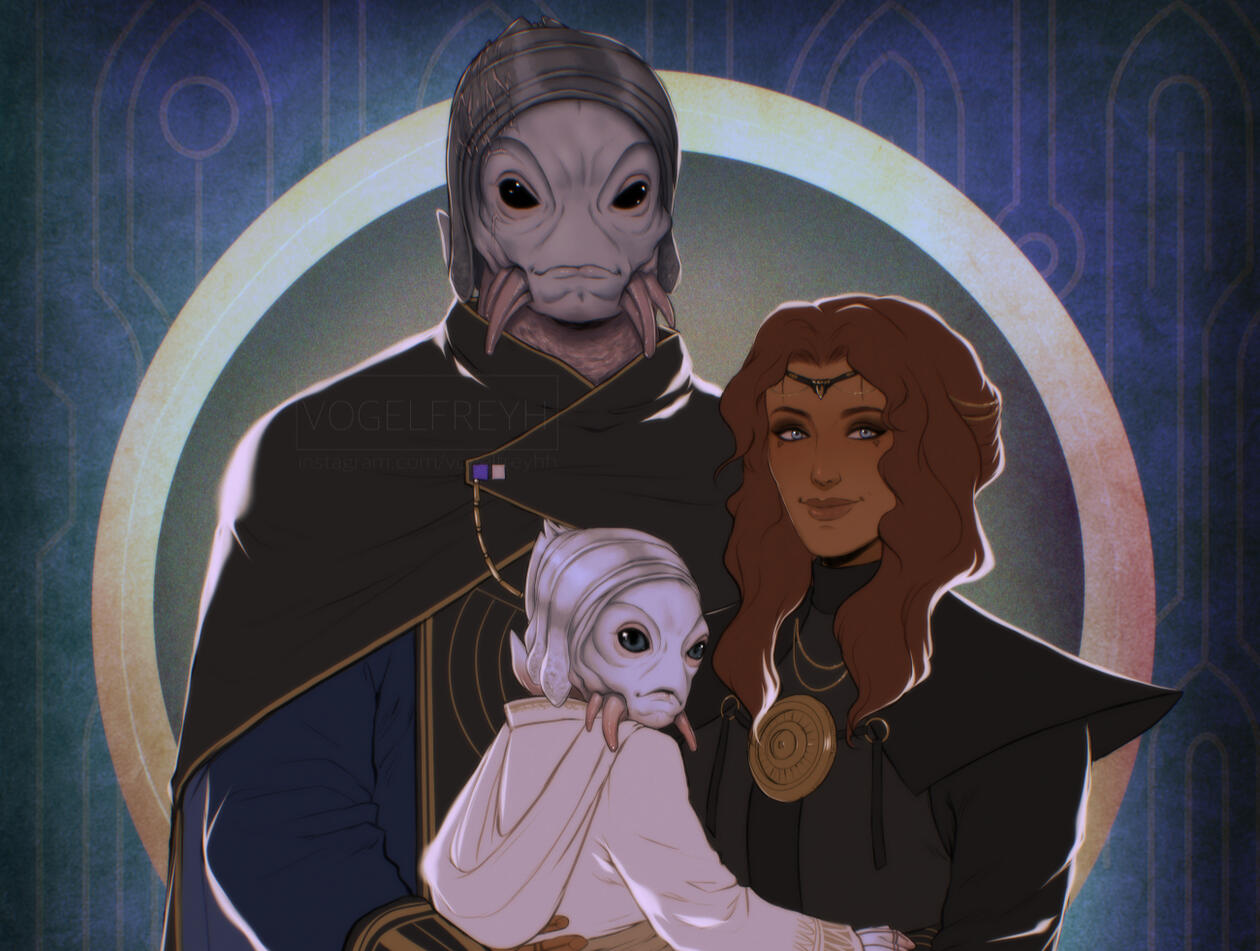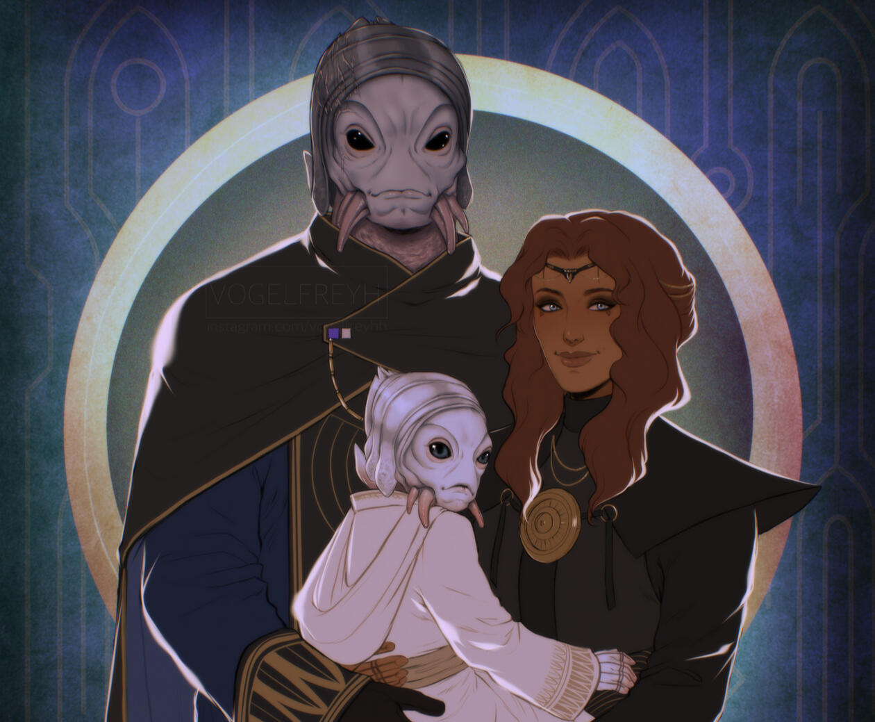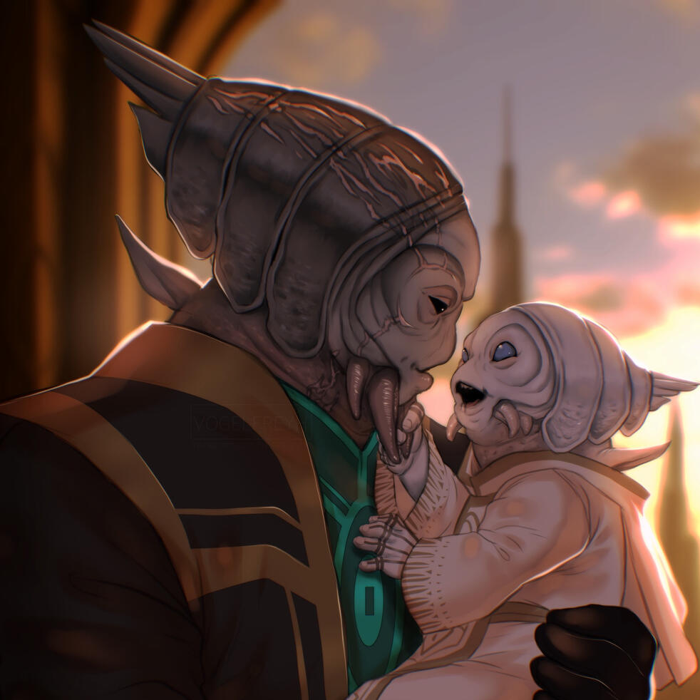 A short time after their reunion, Ti’ad and Sykho were married on Oba Diah in a ceremony that, by Syndicate standards, was uncharacteristically grand. What began as a formal union quickly turned into a multi-day celebration, an event attended by Pyke dignitaries, trusted enforcers, and even a few off-world allies who had stood by them over the years.There were no lavish declarations, no ceremonial speeches, only the quiet certainty between two who had already walked through fire together and the unspoken truth that they had already belonged to one another for years. Their marriage only affirmed what had long been known between them.With Ti’ad now by his side in both life and work, their presence within the Syndicate solidified into something formidable. She took on increasingly critical responsibilities, negotiating high-stakes arrangements, acting as Sykho’s eyes and ears in sensitive territories, and leading missions that required more finesse than brute force.Then, in 6 BBY, Ti’ad became pregnant. Interspecies conception between a Pyke and a Human was unheard of yet. And the moment Sykho learned, something in him shifted. The future, which for so long had been filled only with strategy, blood, and survival, now held something else - legacy.Their son, Gereon, was born under the watchful quiet of Oba Diah’s night sky. He was healthy, strong and rare in every sense. Though his form mirrored that of a young Pyke, there were signs that set him apart. His skin was pale, almost pearlescent, unlike the mottled hues of his father’s kin. His eyes, Davah blue, glowed with the unmistakable intensity of Ti’ad’s Davah ancestry. And his blood ran red, not green.