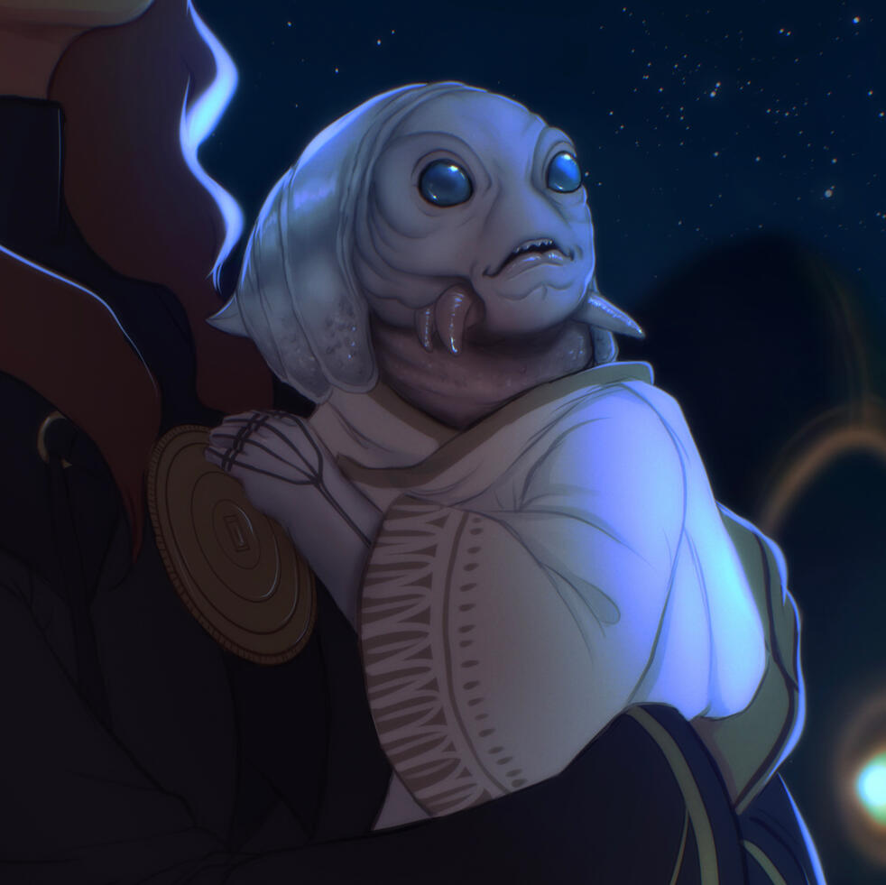And outside of battle, there were quiet moments. Shared glances after close calls, drinks passed across cantina tables, nights spent talking. Without realizing when it had happened, Ti’ad had come to trust him. And he, against every instinct, had come to trust her too. Their connection was undeniable. By the time their third year of working together came, there was no denying that their partnership had become something far more personal.