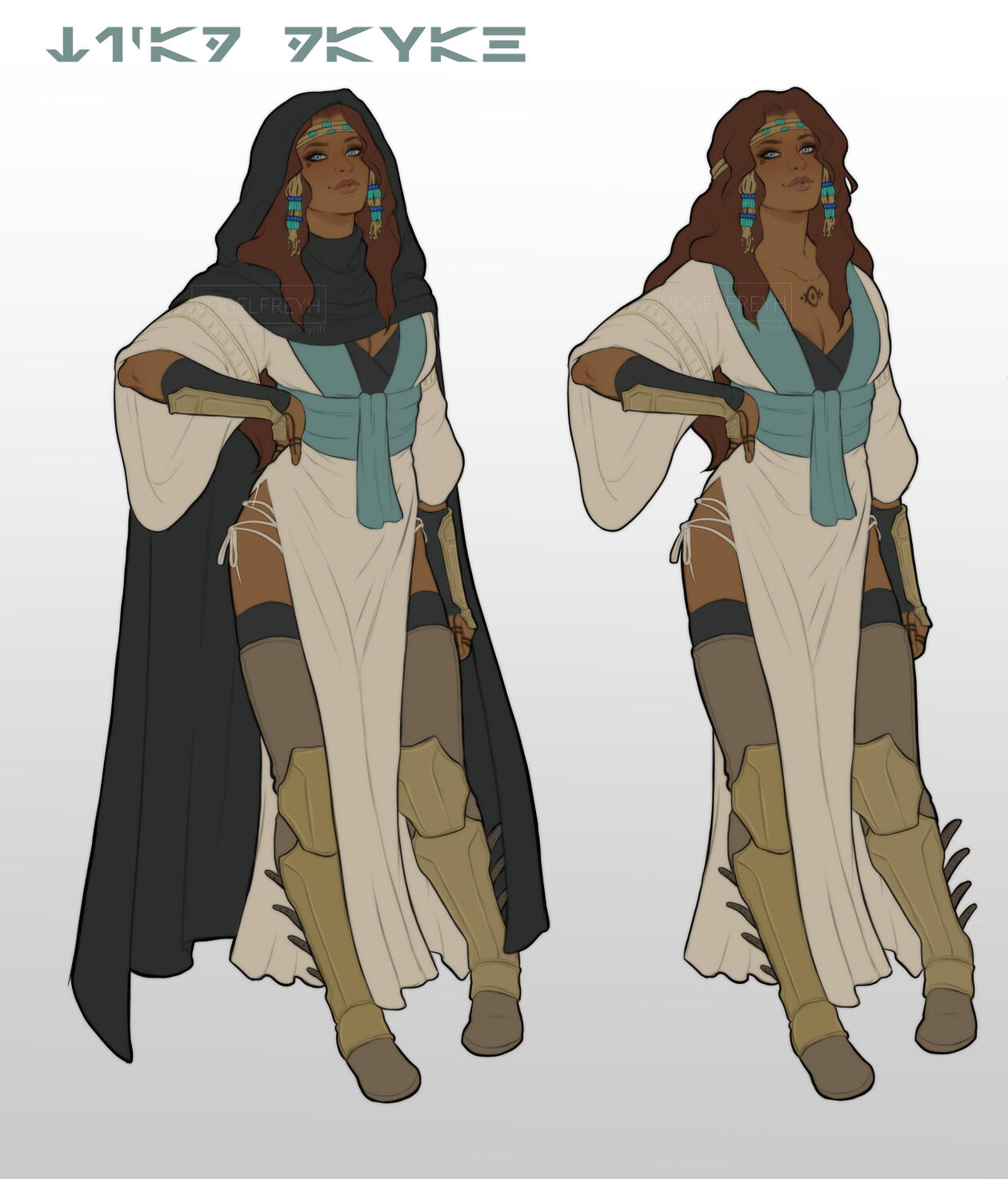 Ti’ad was born in 37 BBY on Yasiah, a desert planet in the Outer Rim. She was a descendant of the extinct Davah, a long-lived, Force-sensitive species known for their striking blue eyes and spiritual traditions. Her early childhood was spent among the last remnants of her people, who clung to their way of life in the face of growing danger.In 33 BBY, when Ti’ad was just four years old, Yasiah was ravaged by violent natural disasters that rendered it uninhabitable. Her mother Ask’kah, a Davah priestess, sacrificed herself to save the surviving members of their clan. The remaining survivors Davah bloodlines fled the destruction and sought refuge in the Outer Rim. They eventually settled on Tatooine, but not without cost.