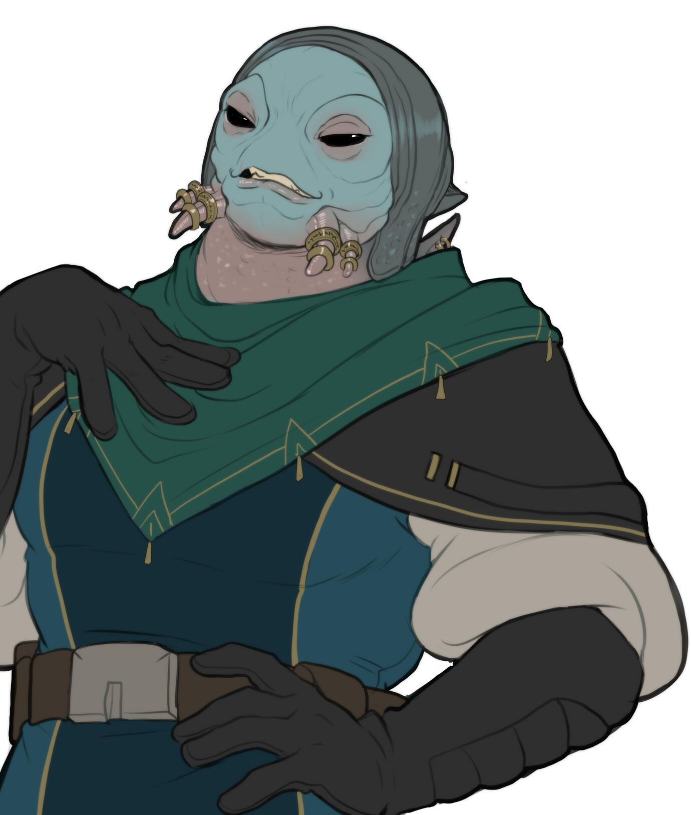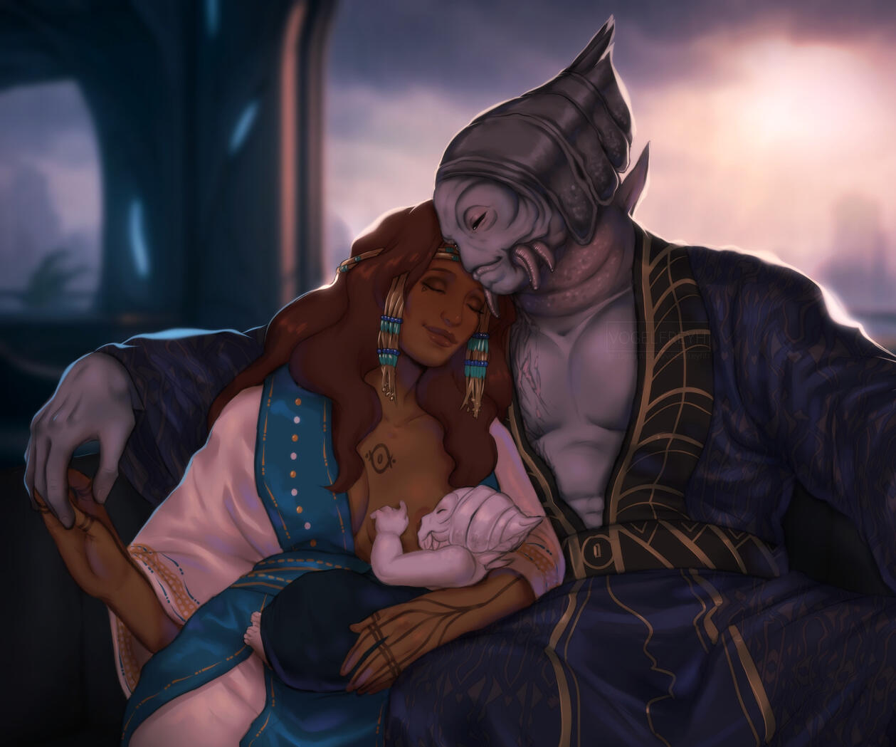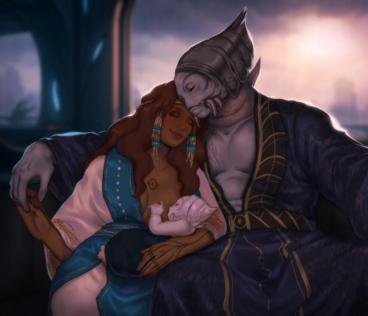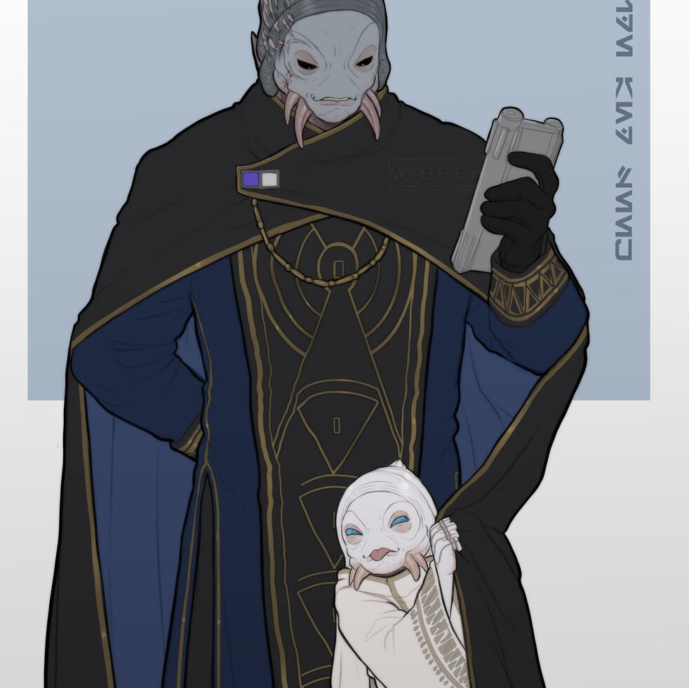 A short time after their reunion, Ti’ad and Sykho were married on Oba Diah in a ceremony that, by Syndicate standards, was uncharacteristically grand. What began as a formal union quickly turned into a multi-day celebration, an event attended by Pyke dignitaries, trusted enforcers, and even a few off-world allies who had stood by them over the years.There were no lavish declarations, no ceremonial speeches, only the quiet certainty between two who had already walked through fire together and the unspoken truth that they had already belonged to one another for years. Their marriage only affirmed what had long been known between them.With Ti’ad now by his side in both life and work, their presence within the Syndicate solidified into something formidable. She took on increasingly critical responsibilities, negotiating high-stakes arrangements, acting as Sykho’s eyes and ears in sensitive territories, and leading missions that required more finesse than brute force.Then, in 6 BBY, Ti’ad became pregnant. Interspecies conception between a Pyke and a Human was unheard of yet. And the moment Sykho learned, something in him shifted. The future, which for so long had been filled only with strategy, blood, and survival, now held something else - legacy.Their son, Gereon, was born under the watchful quiet of Oba Diah’s night sky. He was healthy, strong and rare in every sense. Though his form mirrored that of a young Pyke, there were signs that set him apart. His skin was pale, almost pearlescent, unlike the mottled hues of his father’s kin. His eyes, Davah blue, glowed with the unmistakable intensity of Ti’ad’s Davah ancestry. And his blood ran red, not green.